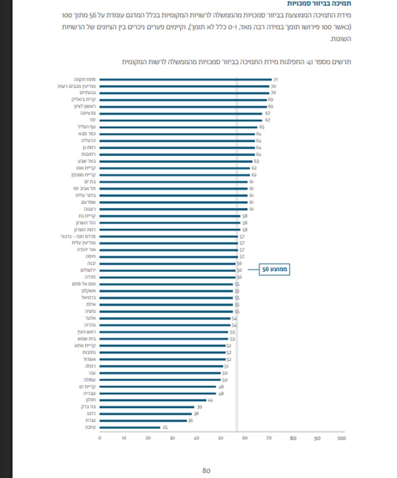 באיזו מידה התושבים תומכים בהעברת סמכויות מהממשלה לעירייה, כדי שלעירייה תהיה יותר השפעה על תחומים מקומיים שונים- העיר קבלה ציון 69