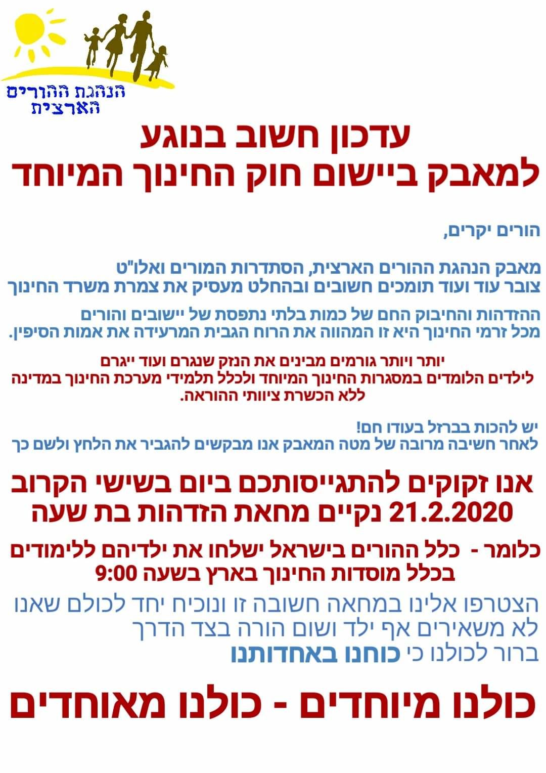 שביתה? פורום ועדי ההורים היישוביים קורא להורי ישראל לשלוח ביום שישי 21/2 את התלמידים בשעה 09:00 לבית הספר לאות הזדהות עם המאבק ביישום חוק החינוך המיוחד