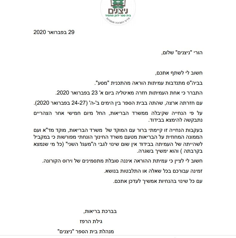 על פי הנחיית משרד הבריאות התלמידים יכולים בשלב זה להמשיך בשגרה