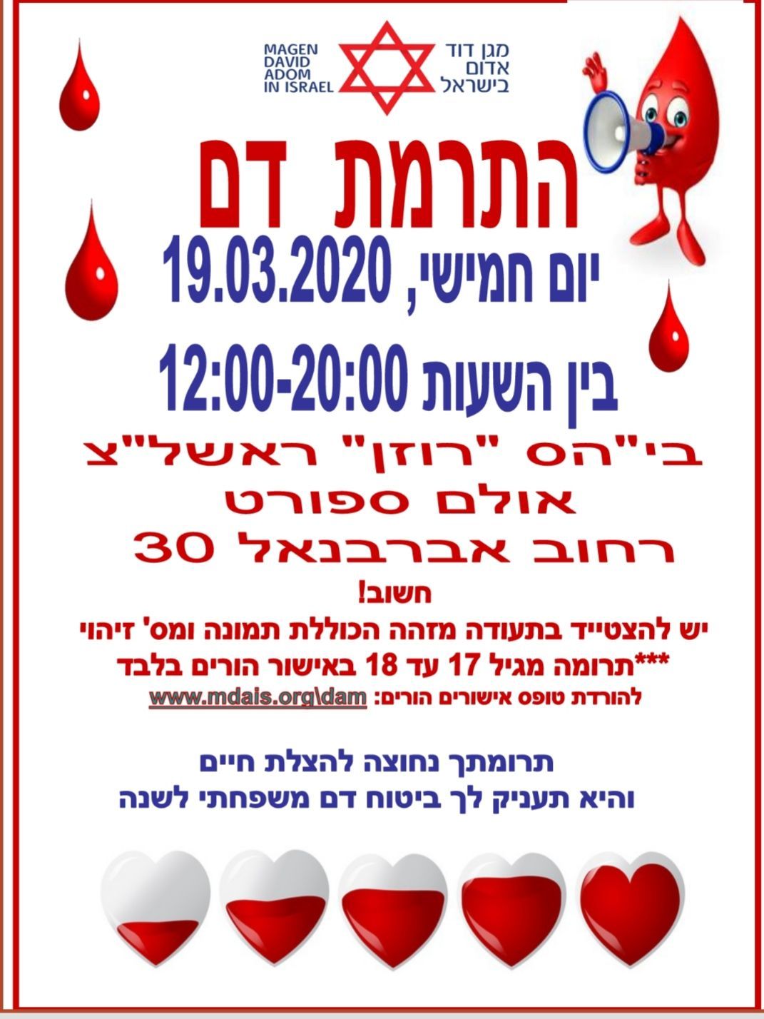 בית ספר רוזן בראשון לציון יקיים בשיתוף הנהגת ההורים הבית ספרית אירוע התרמת דם ב יום חמישי הקרוב 19.3.20 החל מהשעה 12:00 ועד 20:00 אולם הספורט בביהס "רוזן"