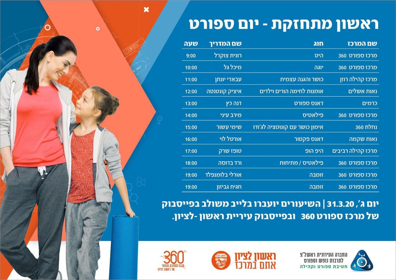 עיריית ראשון לציון בשיתוף מרכזי הקהילה של החברה העירונית יקיימו מחר (שלישי 31.3.20) יום ספורט עירוני מיוחד שיועבר בלייב בפייסבוק של מרכז הספורט 360 ובפייסבוק של עיריית ראשון לציון. במהלך היום יוכלו התושבים ליהנות מאימוני כושר של יוגה, היפ הופ, פילאטיס, זומבה, היט ועוד.