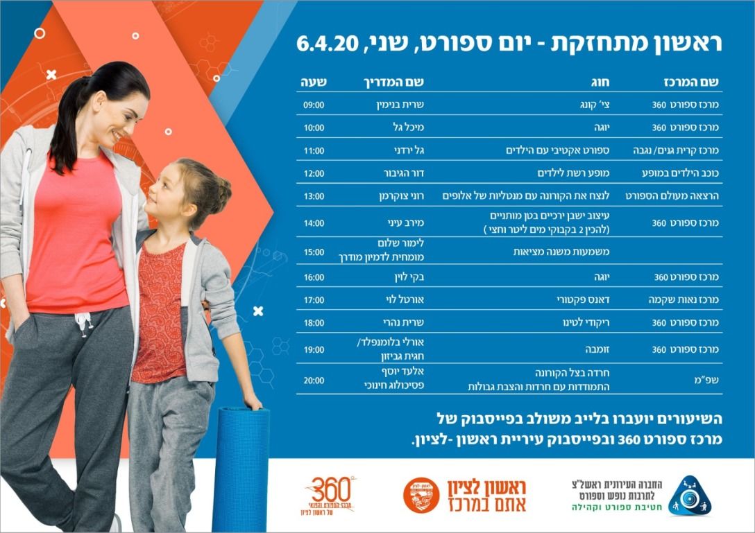 עיריית ראשון לציון בשיתוף מרכזי הקהילה של החברה העירונית יקיימו היום (שני 6.4) יום ספורט עירוני מיוחד שיועבר בלייב בפייסבוק של מרכז הספורט 360 ובפייסבוק של עיריית ראשון לציון. במהלך היום יוכלו התושבים ליהנות מאימוני כושר של יוגה, זומבה, ריקוד לטינו ועוד.