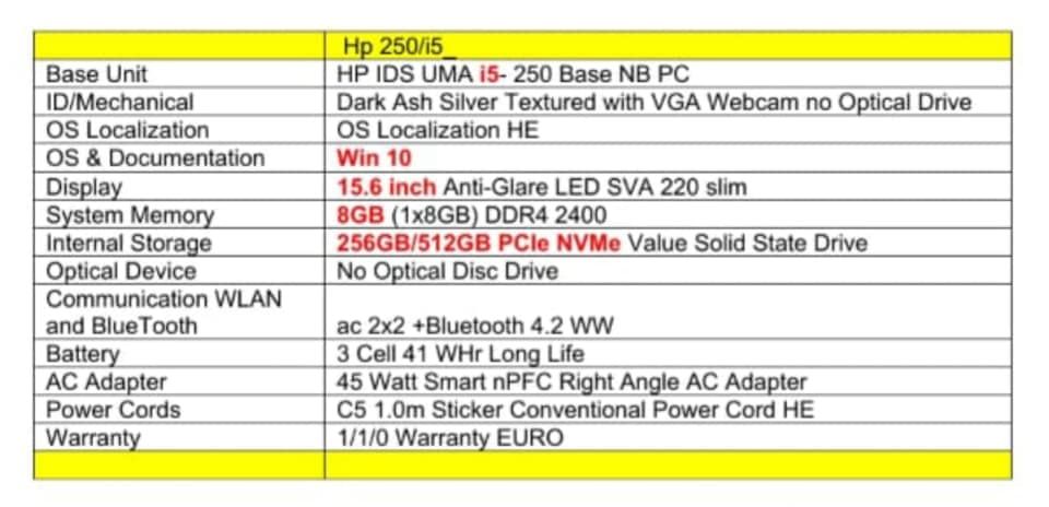 מדובר במחשב נייד מדגם HP250 i5 מסך 15.6", זיכרון 8 GB וקשיח 256/512 GB כולל וינדוס ואופיס.