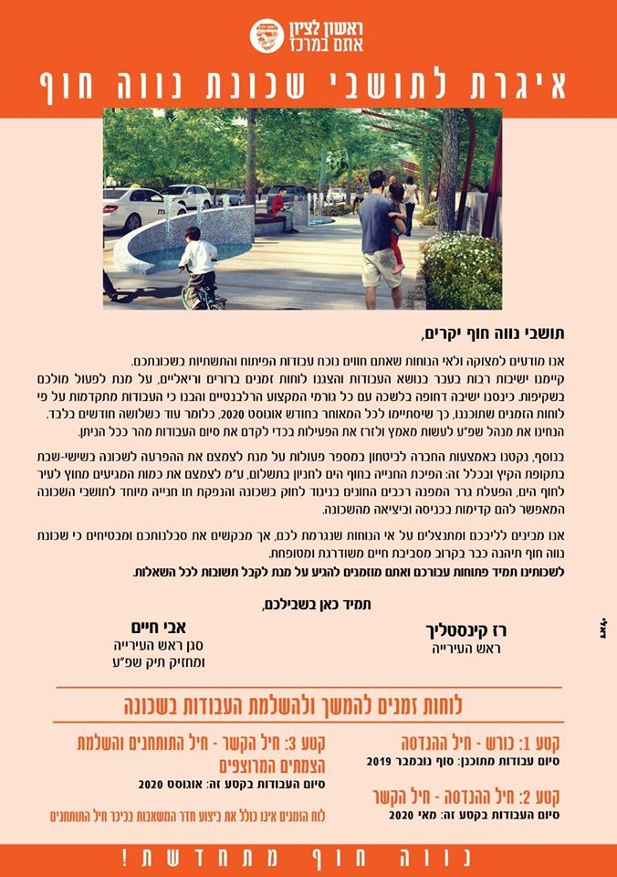 כפי שפרסמנו אמש תושבי נווה חוף עתידים, לצאת להפגנה מחר (שישי 15.5) כאות מחאה על עבודות התשתית הנערכות בשכונה כבר למעלה מ3 שנים, ברחוב זלמן שז"ר. היום (חמישי) הוציאה העירייה הודעה לתושבים כי לאחר קיום פגישה דחופה בנושא, הבהירו גורמי המקצוע כי העבודות נעשות על פי לוח הזמנים ועל כן כל העבודות עתידות להסתיים כפי שקבעו בעוד שלושה חודשים - אוגוסט 2020. עוד נאמר בהודעה כי מנהל השפ"ע הונחה להאיץ בעבודות על מנת לסיימן בהקדם.