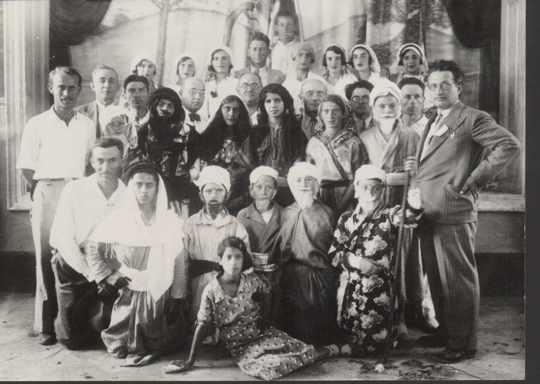חג השבועות בי"הס חביב- צילום קבוצתי של מורים ותלמידים מחופשים לדמויות מהתנך. שושנה דמארי, סעדיה דמארי, המורים מימין: דב אלוני, דב יוסיפון, שרשבסקי, ז'בוטינסקי, קרון, נפחא שרגא, ידלין, רוזין, משה ברשבסקי. מימין שורה למטה, דוד נפחהשנהרג עם כ"ג יורדי הסירה.