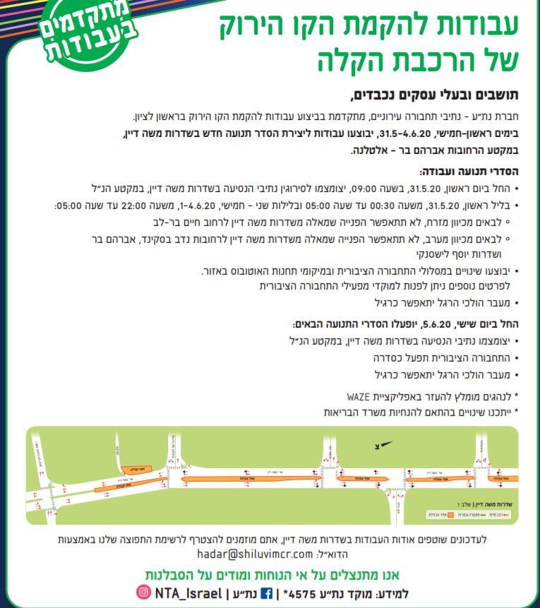 החל ביום ראשון, 31.5.20, בשעה 09:00, יצומצמו לסירוגין נתיבי הנסיעה בשדרות משה דיין, במקטע הנ"ל.