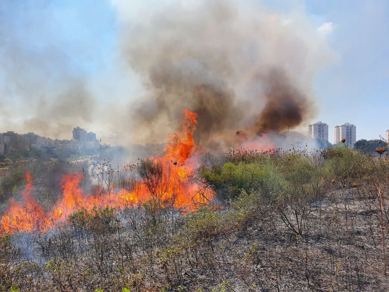 4 צוותים פעלו בשריפת קוצים וחורש טבעי בשטח הפתוח המקביל לשדרות יצחק רבין.
