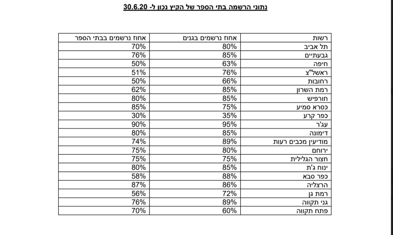 מרכז השלטון המקומי חושף לראשונה את נתוני הרשמה שהגיעו מהרשויות המקומיות ברחבי הארץ המצביעים על נתוני הרשמה מרשימים לתוכנית בית הספר של הקיץ בייחוד בגילאי הגן שנוספו לתכנית רק השנה. התוכנית, שתתחיל לפעול מחר בגנים ובתי הספר הממלכתיים עד כיתות ד', פועלת השנה באופן מורחב ועד לתאריך ה- 6.8.20. התכנית גובשה ע"י מרכז השלטון המקומי, משרד החינוך, משרד האוצר ומשרד ראש הממשלה כדי לתת מענה להורים לאור מצב המשק במגפת הקורונה.