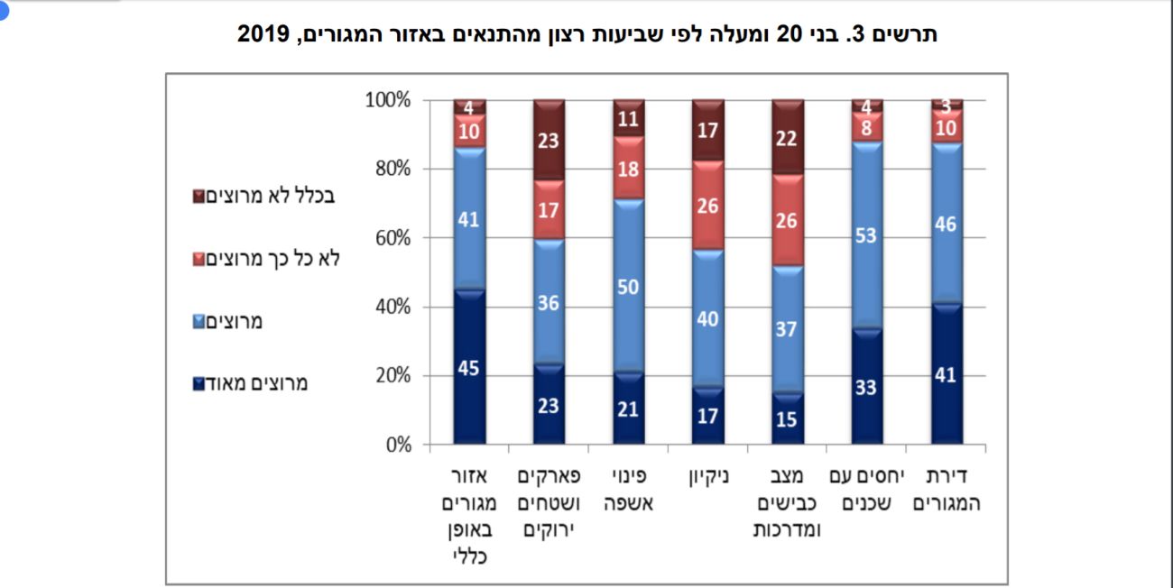 יחד עם זאת, רבים מרוצים מהיחסים עם השכנים 86% ,ומהדירה שבה הם גרים – 87% ול51% אין מספיק חנייה באזור המגורים.