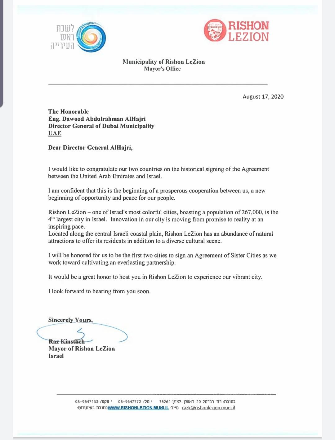 ראש עיריית ראשון לציון, רז קינסטליך, שיגר מכתב למקבילו בעיר דובאי מוחמד בן ראשד אאל מכתום ובו הוא מברך על ההסכמים בין ישראל לאיחוד האמירויות ומקווה שאלו יובילו לפריחה ושגשוג. כמו כן, הציע קינסטליך לכרות ברית ערים תאומות.