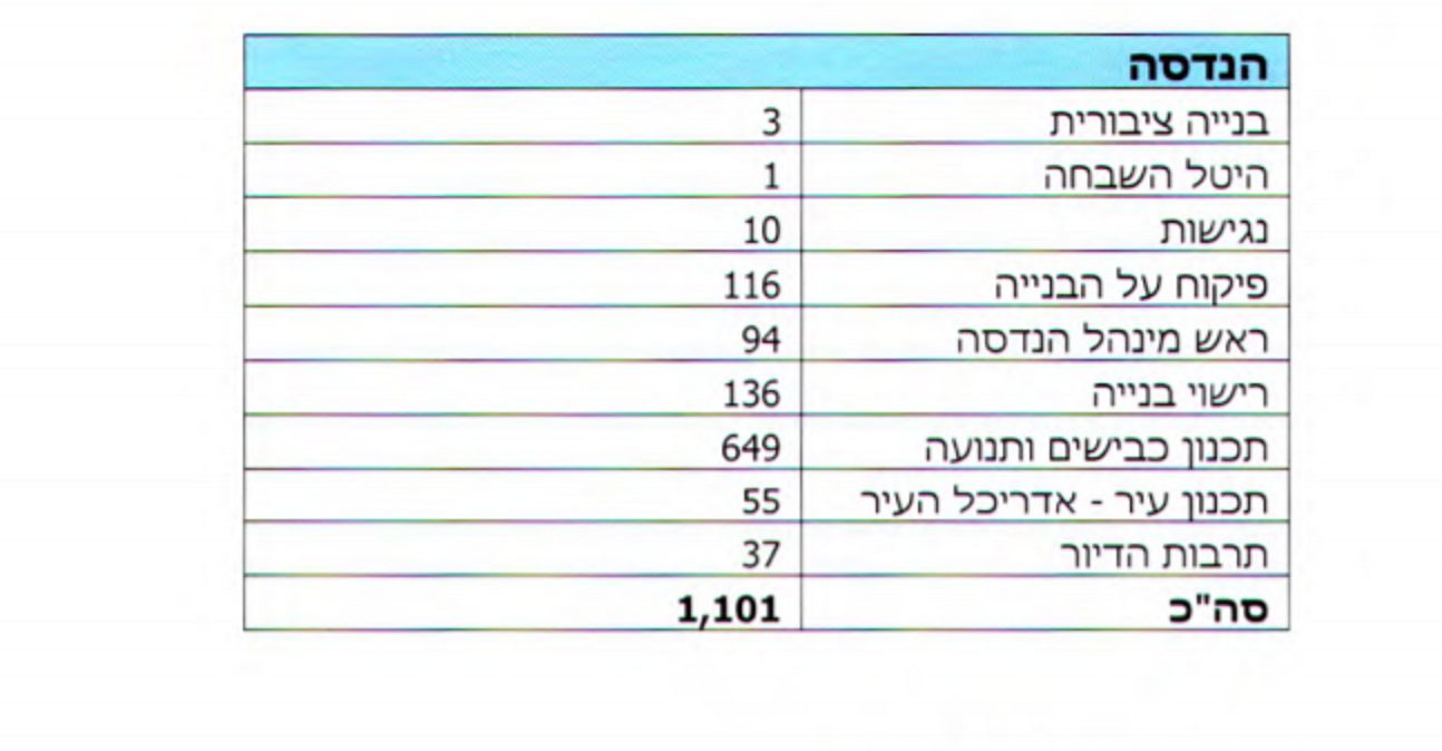 על פי הנתונים האגף שקיבל את הכי הרבה פניות הוא מינהל ההנדסה עם מעל לאלף פניות.