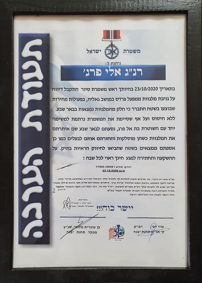 למרות שסיים את המשמרת החליט יחד עם השוטרת בת אל פרג לנסוע ולאתר את המלגזות בבאר שבע ולאחר חיפושים אותו המלגזות כשהן מוסלקות.על כך קבלו רנ"ג אלי פרג' והשוטרת בת אל פרג תעודות הערכה