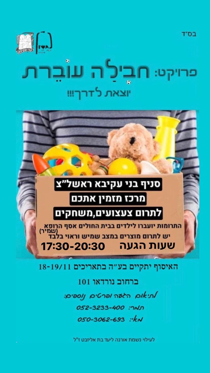 מבצע חבילה עוברת של בני עקיבא ראשון לציון יוצא לדרך! בימים רביעי וחמישי (18-19.11) יוצאים חניכי התנועה למבצע התרמה של צעצועים ומשחקים למען מחלקת הילדים בביה"ח שמיר -אסף הרופא; התרומות יאספו בסניף התנועה - יש לתאם הגעה מראש בטל' 052-3233400 או 050-3062693