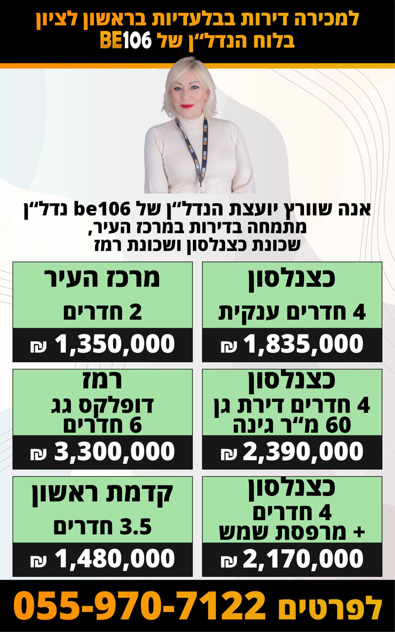 055-432-2106 מחטיבת הנדל"ן של be106 המתמחה בשכונת רמז וכצנלסון בראשון לציון