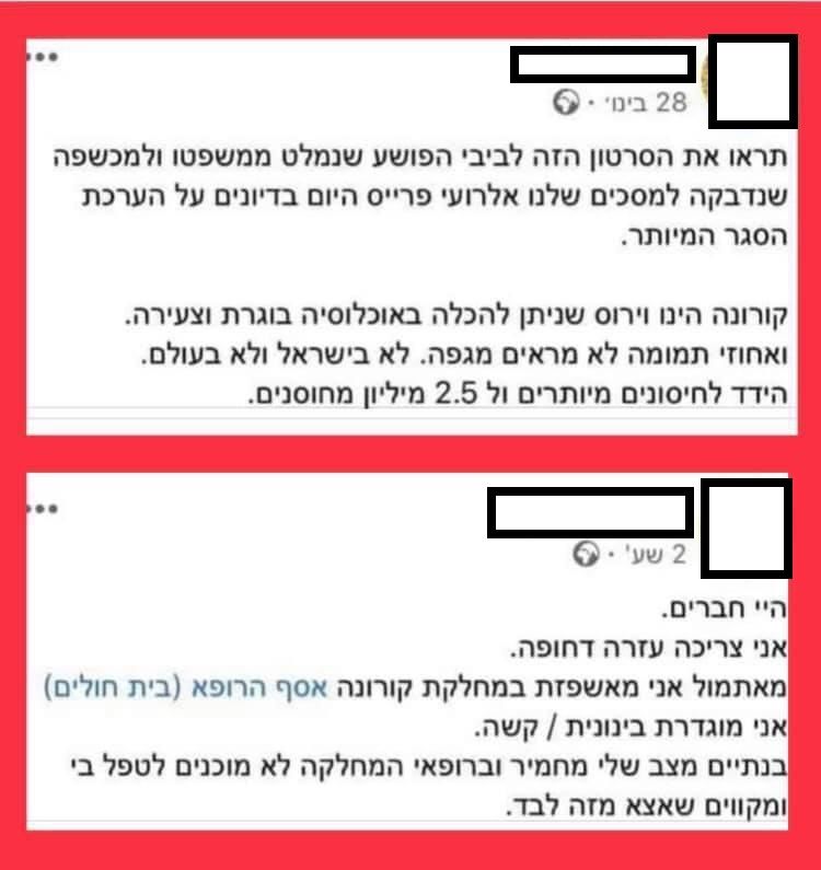 גולשים שזיהו כי חולת הקורונה הזועקת לעזרה היא מהפעילות הבולטות ברשת בנושא הכחשת הקורונה החלו להעלות פוסטים שלה שבה הכחישה קורונה והתנגדה לחיסונים ויצאה בפוסטים קשים נגד ראש הממשלה וגורמי משרד הבריאות.