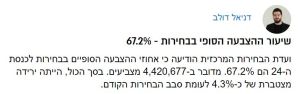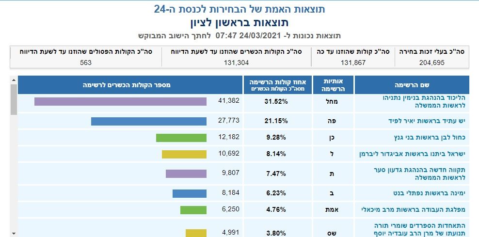 במהלך היום יפורסם עדכון תוצאות וביום שישי 26/3 יפורסמו התוצאות הרשמיות לאחר סיום ספירת הקולות הכפולים