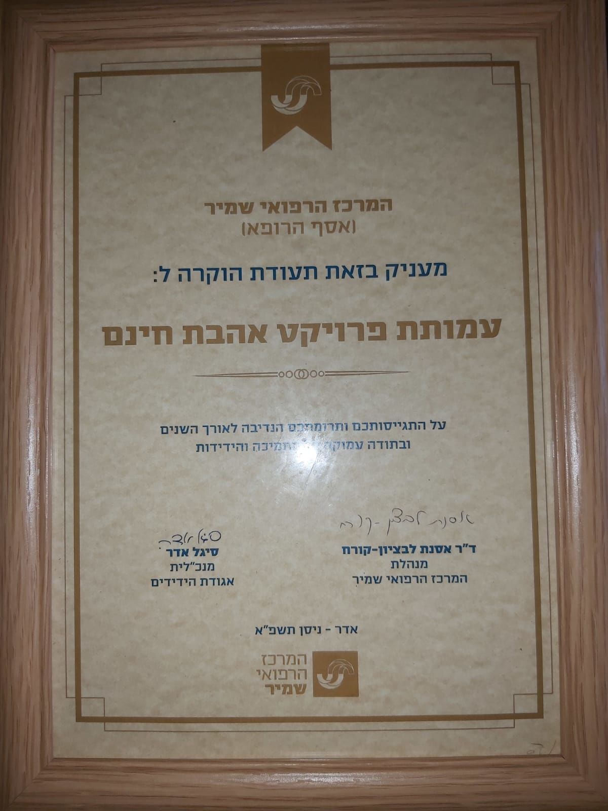המרכז הרפואי העניק תעודת הוקרה לפרוייקט אהבת חינם של איתן לוין מראשון לציון