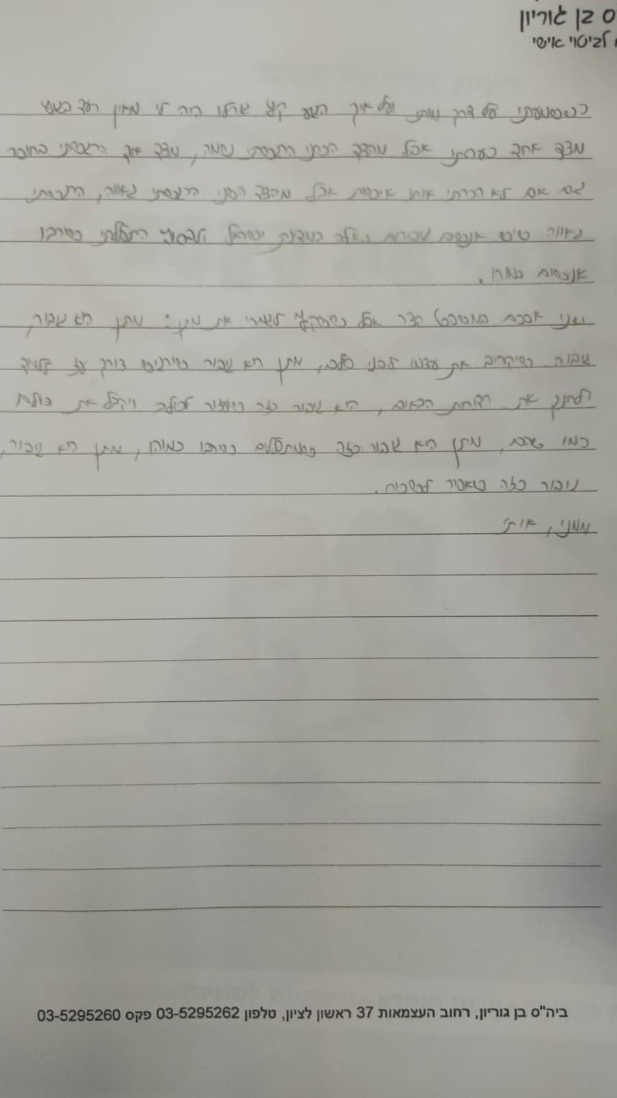 "בכל שנה התלמידים כותבים אל משפחות הנופלים מראשון לציון אחרי שלמדו על החלל ומצאו את קווי הדמיון בינם לבין החלל. השנה זכינו לשותפים רבים מהצוות שלקחו חלק בפרויקט ומודה לכל הצוות החינוכי על שזיכיתם אותי לעמוד בראש מוסד ערכי שכזה".