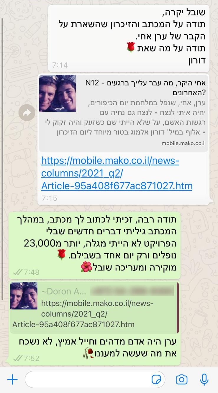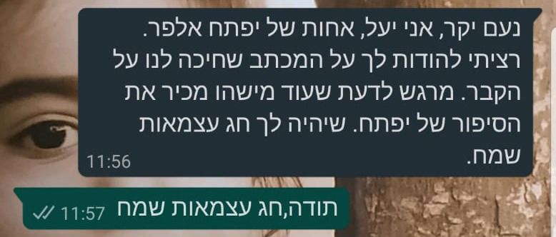 משפחות הנופלים הגיעו הבוקר לחלקות הצבאיות בבית העלמין ומצאו את המכתבים שהשאירו התלמידים שלמדו על כל חלל. יעל, אחותו של סגן יפתח אלפר ז"ל, מצאה את המכתב של התלמיד נעם וכתבה לו: "רציתי להודות לך על המכתב שחיכה לנו על הקבר. מרגש לדעת שעוד מישהו מכיר את הסיור של יפתח"