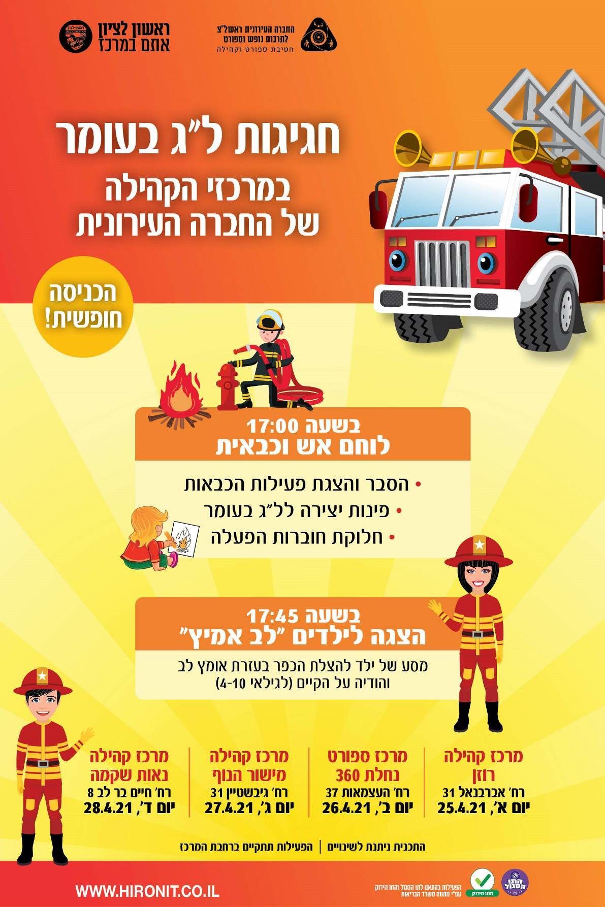 4 ימים של חגיגות ל"ג בעומר במרכזי הקהילה בראשון לציון! החל היום (ראשון 25.4) במשך ארבעה ימים תתקיים פעילות בסימן ל"ג בעומר עם לוחמי האש, פינות יצירה והצגת ילדים; הפעילות תתקיים במרכזי הקהילה: נחלת יהודה, רוזן, מישור הנוף ונאות שקמה