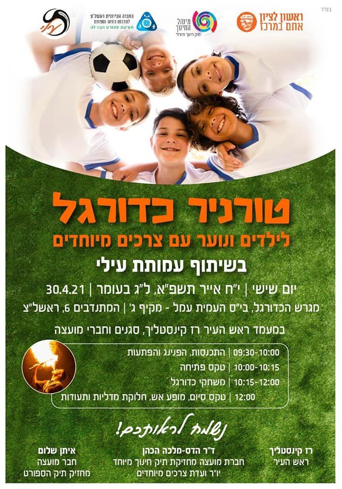 ביוזמת חברת המועצה, ד"ר הדס הכהן, ביום שישי 30.4 ייצא לדרך טורניר הכדורגל לילדים ונוער עם צרכים מיוחדים במגרש הכדורגל בעמית עמל בראשון לציון