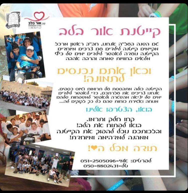 בימים הקרובים תיסגר ההרשמה לקייטנת "אור בלב" לילדים עם צרכים מיוחדים המתקיימת על ידי חניכי בני עקיבא בראשון לציון; מספר המקומות מוגבל לפרטים והרשמה: אמי 0512505096 ארז 058-424-2709