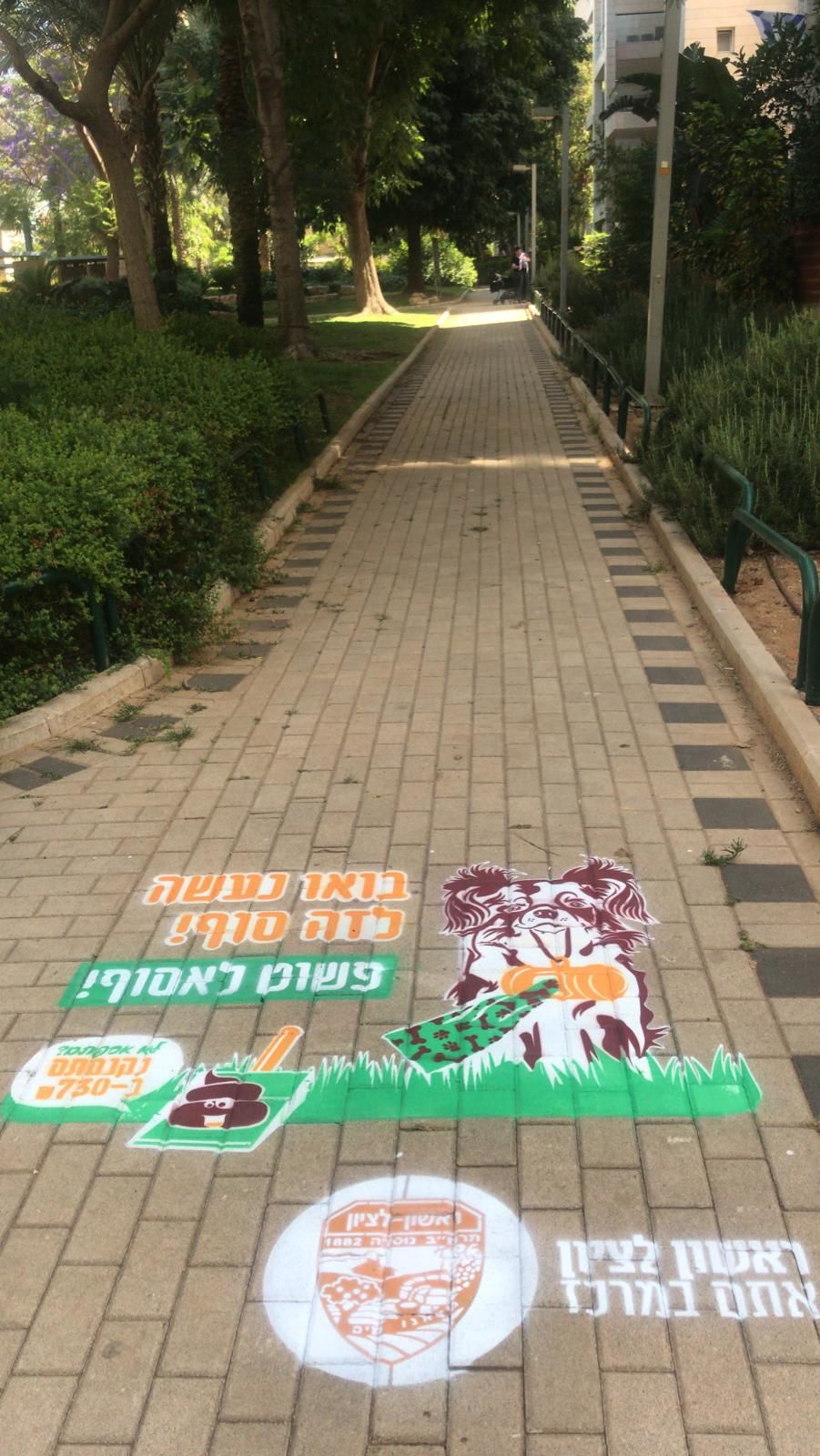 כחלק מהתמודדות עם בעיית צואת הכלבים ברחובות והצלחת הפיילוט, ב-50 גני ציבוריים בראשון לציון יוטבע הדפס רצפתי סביבתי עם המסר: "בואו נעשה לזה סוף! פשוט לאסוף"