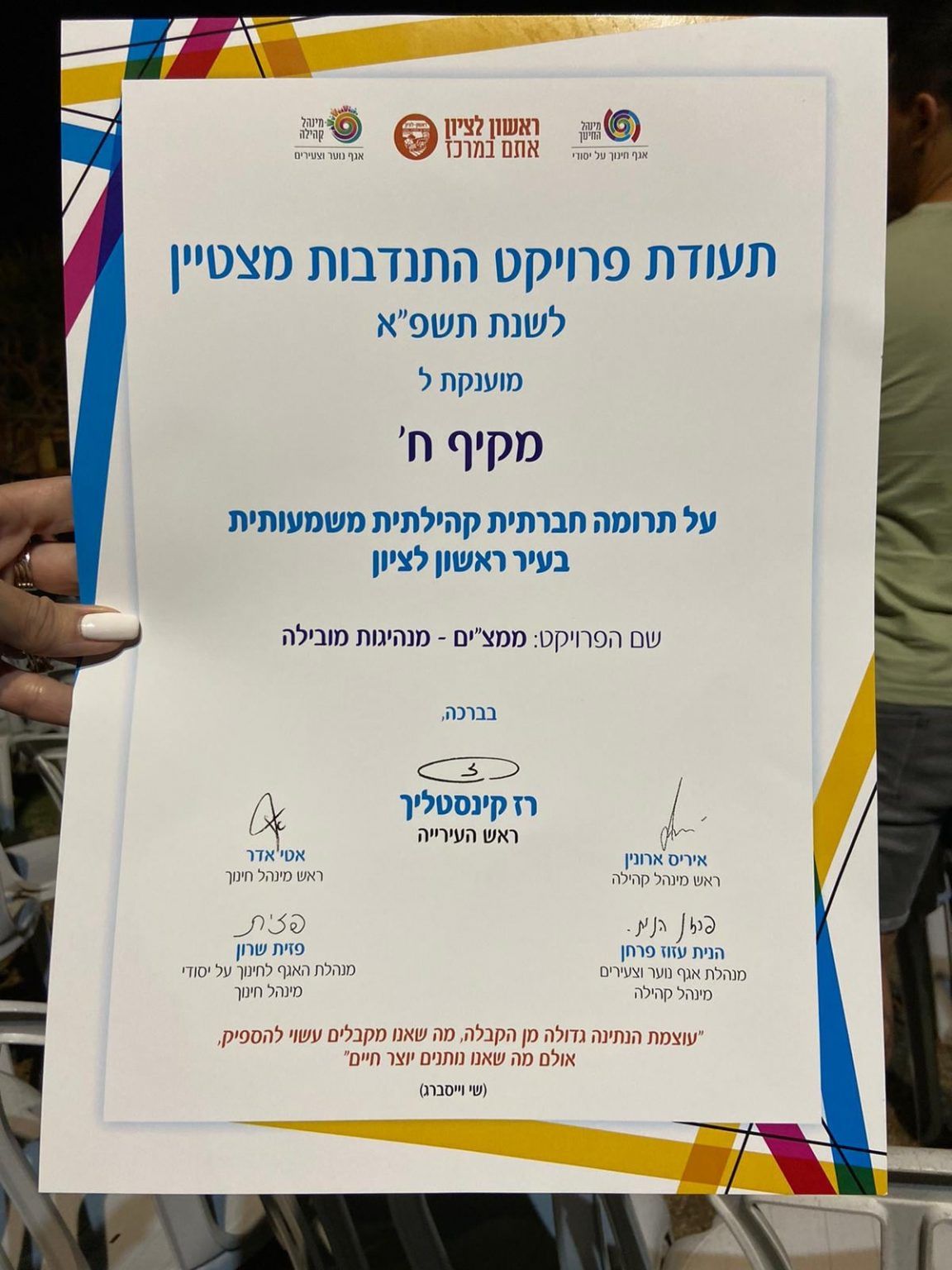 במהלך הטקס ניתן אות הפעיל המצטיין המחוזי במעמד ויקי ניצן מנהלת מנהל חברה ונוער במשרד החינוך, ראש העיר רז קינסטליך, מחזיקת תיק החינוך עו"ד ליאל אבן זוהר ומחזיק תיק נוער וצעירים איתי מתיתיהו.