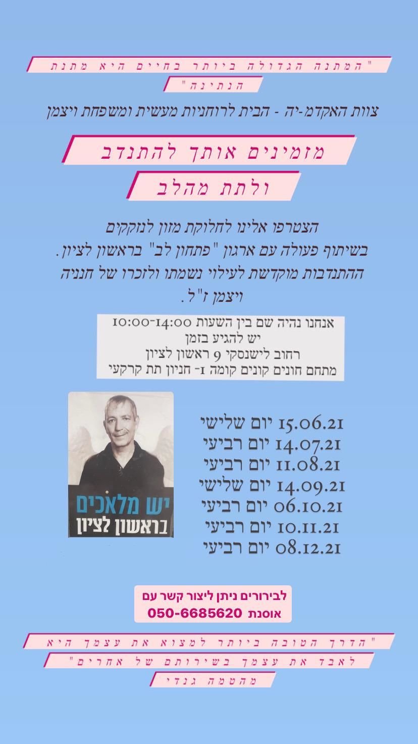 לזכרו של תושב ראשון לציון חנניה ויצמן ז"ל ומתנדב פתחון לב פתחה משפחתו במיזם מיוחד במסגרתו יתקיימו מדי חודש ימי התנדבות מיוחדים במרכז הסיוע של פתחון לב
