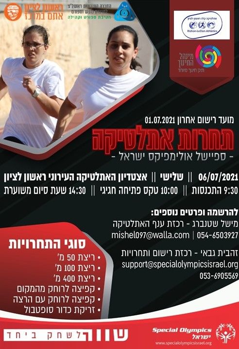 היום (שלישי 6.7) תתקיים תחרות האתלטיקה של ספיישל אולימפיקס לילדים עם צרכים מיוחדים באצטדיון האתלטיקה בראשון לציון; הורים המעוניינים לצרף את ילדיהם יש להירשם אצל זהבית 0536905569