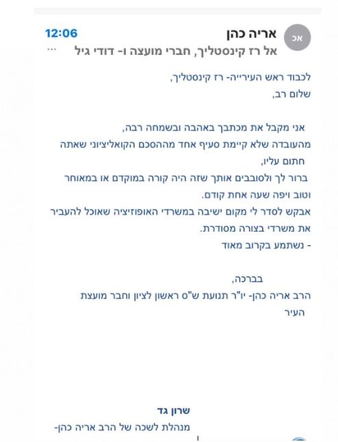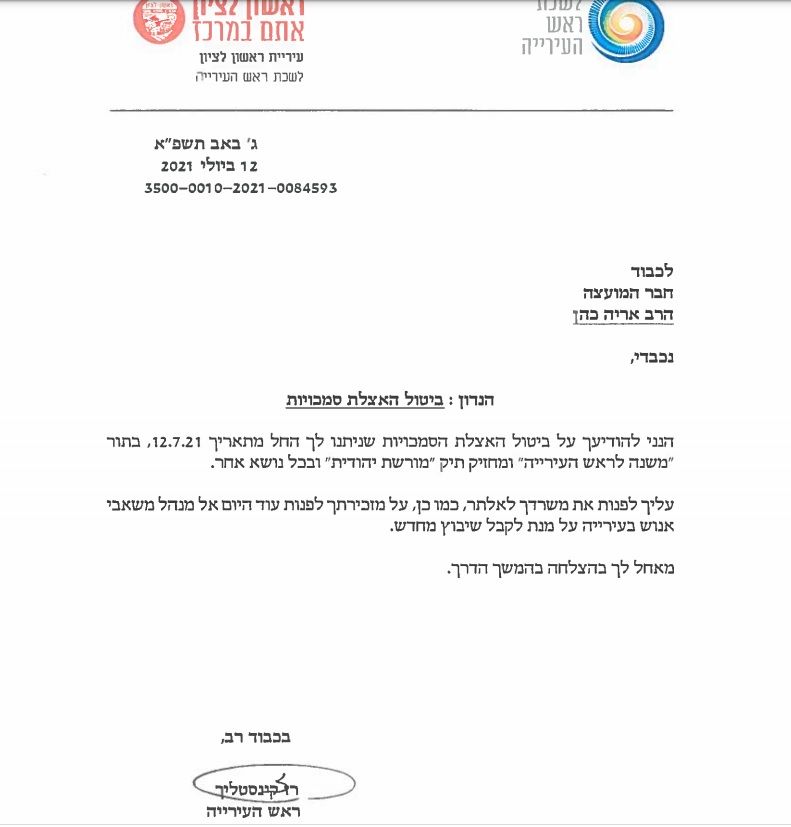 מצורף מכתב ההדחה שהוציא רז קינסטליך לאריה כהן ומכתב התגובה של אריה כהן