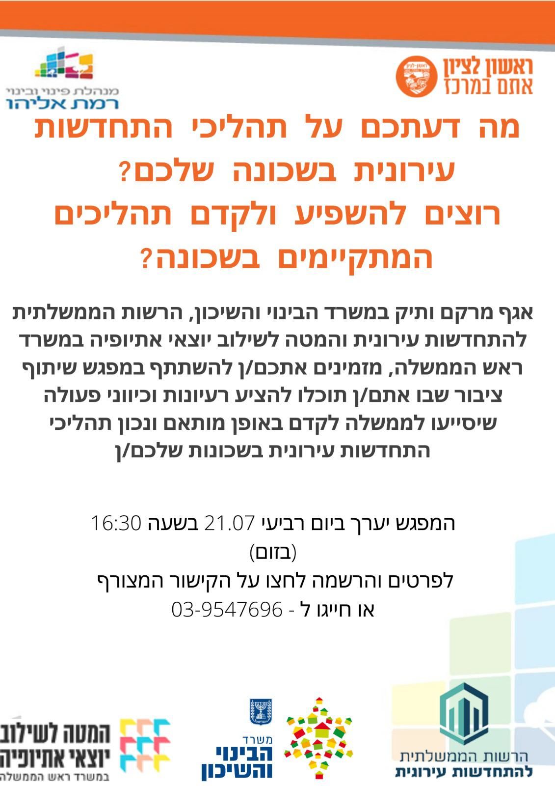 מדובר על מפגש שמקיימים אגף מרקם ותיק במשרד הבינוי והשיכון, הרשות הממשלתית להתחדשות עירונית והמטה לשילוב יוצאי אתיופיה במשרד ראש הממשלה, כדי לתת לתושבים הזדמנות להציע רעיונות וכיווני פעולה שיסייעו לממשלה לקדם באופן מותאם ונכון תהליכי התחדשות עירונית ברמת אליהו.