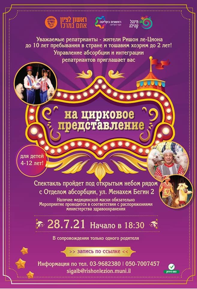 אגף הקליטה בעיריית ראשון לציון מזמין את העולים החדשים בעיר למופע קרקס מיוחד עבורם. המופע יתקיים מחר (רביעי 28.7) החל משעה 18:30 ברחבת אגף הקליטה ברחוב מנחם בגין 2