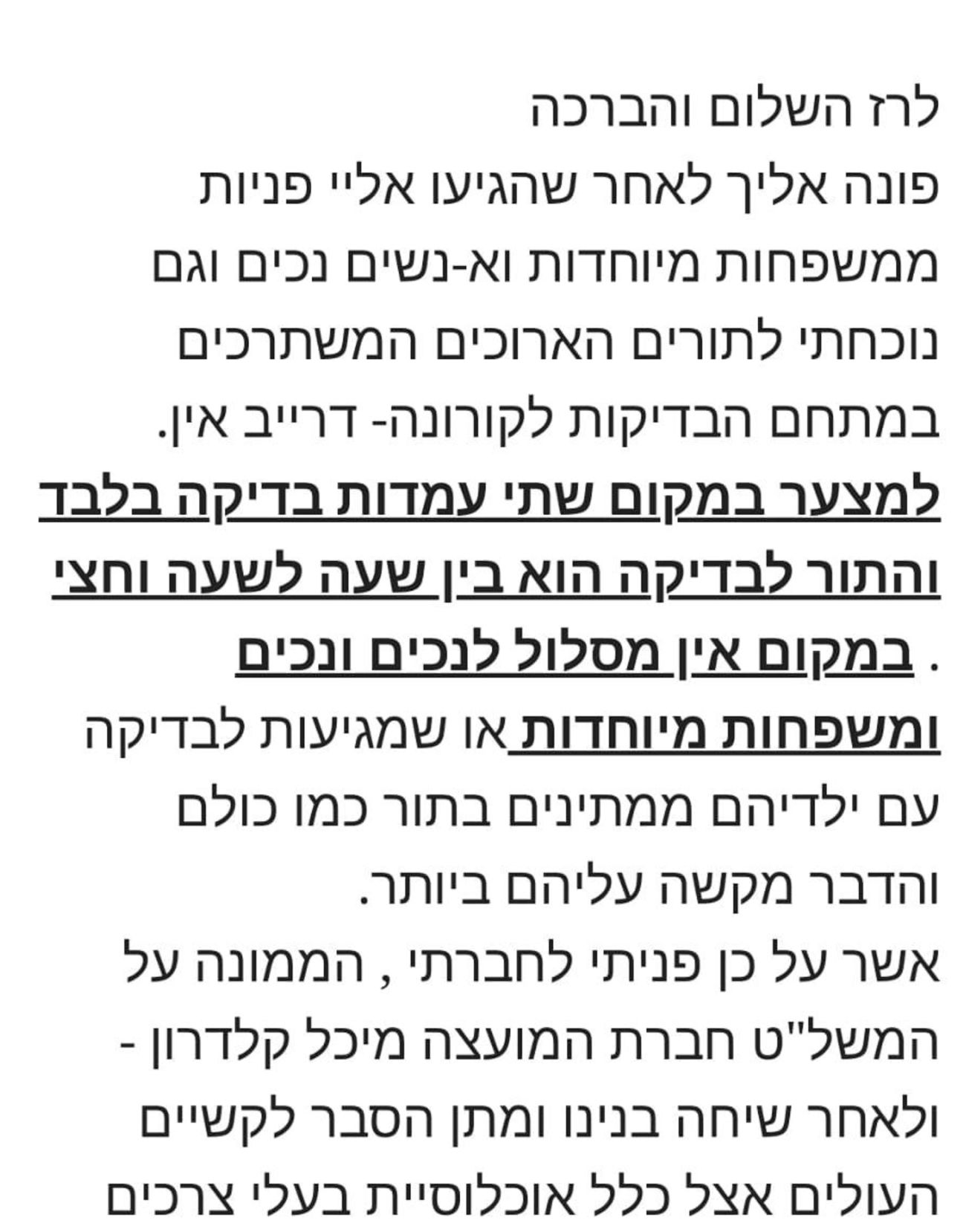 לאור העומסים ופניות התושבים פנתה חברת המועצה, ד"ר הדס הכהן לראש העיר על מנת לאפשר לנכים ובעלי המוגבלות לבצע את הבדיקות במסלול מיוחד שנפתח עבורם במקום.