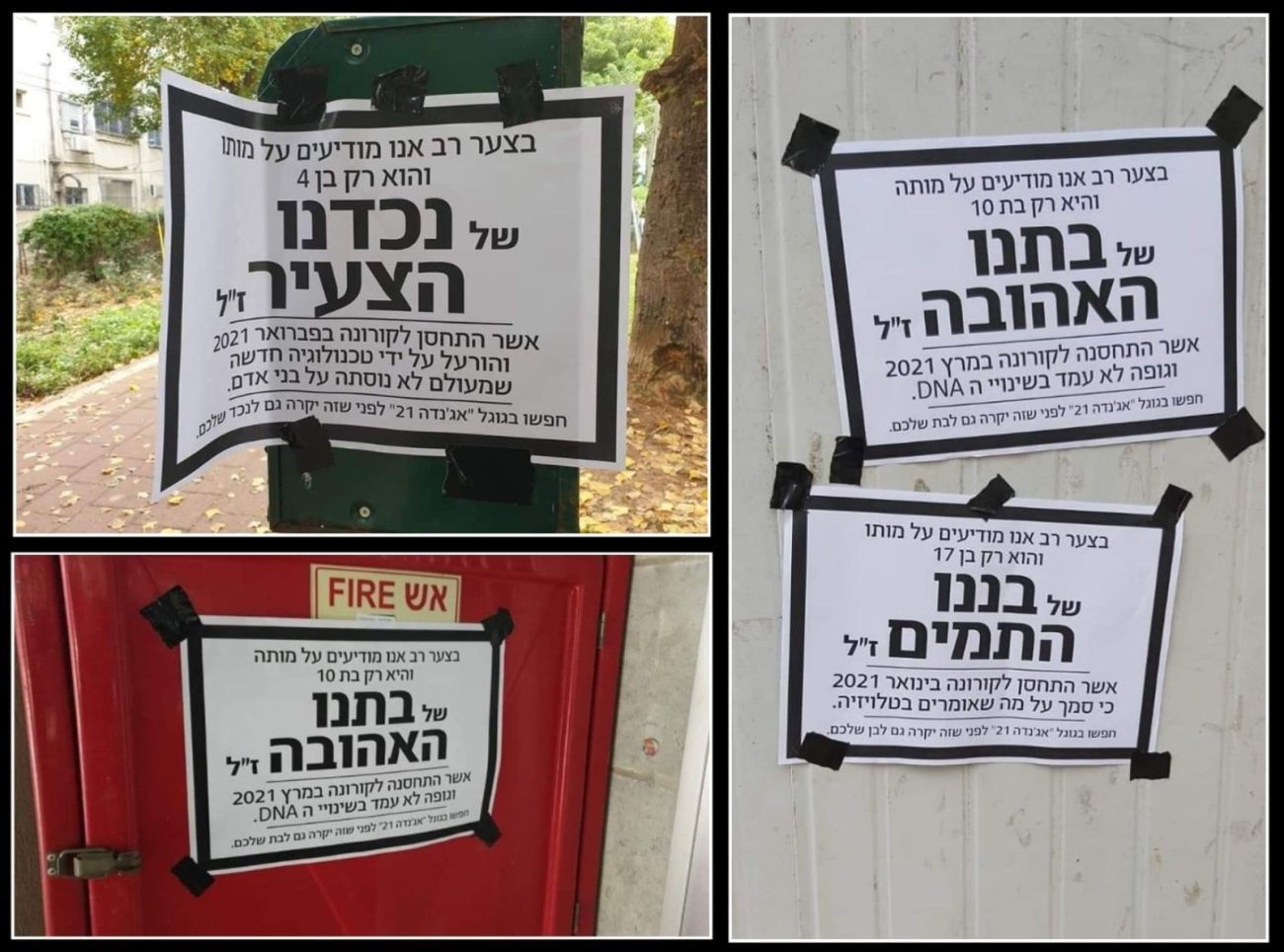 ד"ר ליאור אונגר הנלחם במתנגדי החיסונים ומפיצי הפייק ניוז בנושא החיסונים "בראשון לציון נתלו מודעות אבל שקריות ומזעזעות על ילדים קורבנות חיסוני קורונה כדי להפחיד את הציבור למרות שילדים לא אמורים בכלל להתחסן". המודעות הפיקטיביות נתלו במספר ערים במרכז הארץ