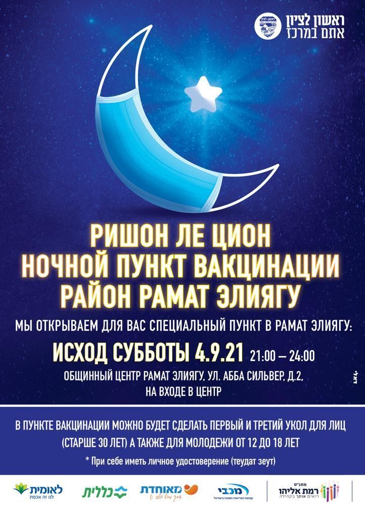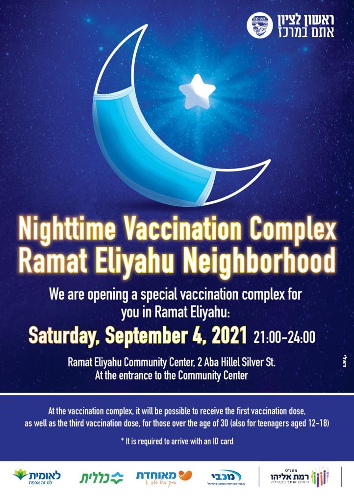 במוצ"ש 4.9 יפתח במתנ"ס רמת אליהו בראשון לציון מתחם חיסוני קורונה לכלל התושבים שיוכלו לקבל מנת חיסון ראשונה או מנת בוסטר (מנה שלישית)