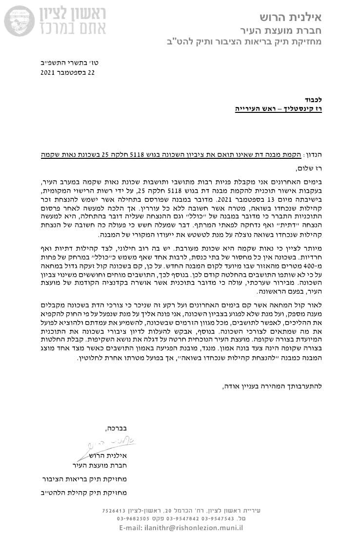 פרסום הסיור של אילנית הרוש עורר את כעסה של חברת המועצה, ד"ר הדס הכהן שיצאה נגד הוויכוח המתנגד להקמת מבנה דת בשכונה. לטענתה בכל פעם שיש עניין הקשור לשירותי דת קמה סערה בעיר ובמועצה דבר שיוצר התקוממות בקרב התושבים.