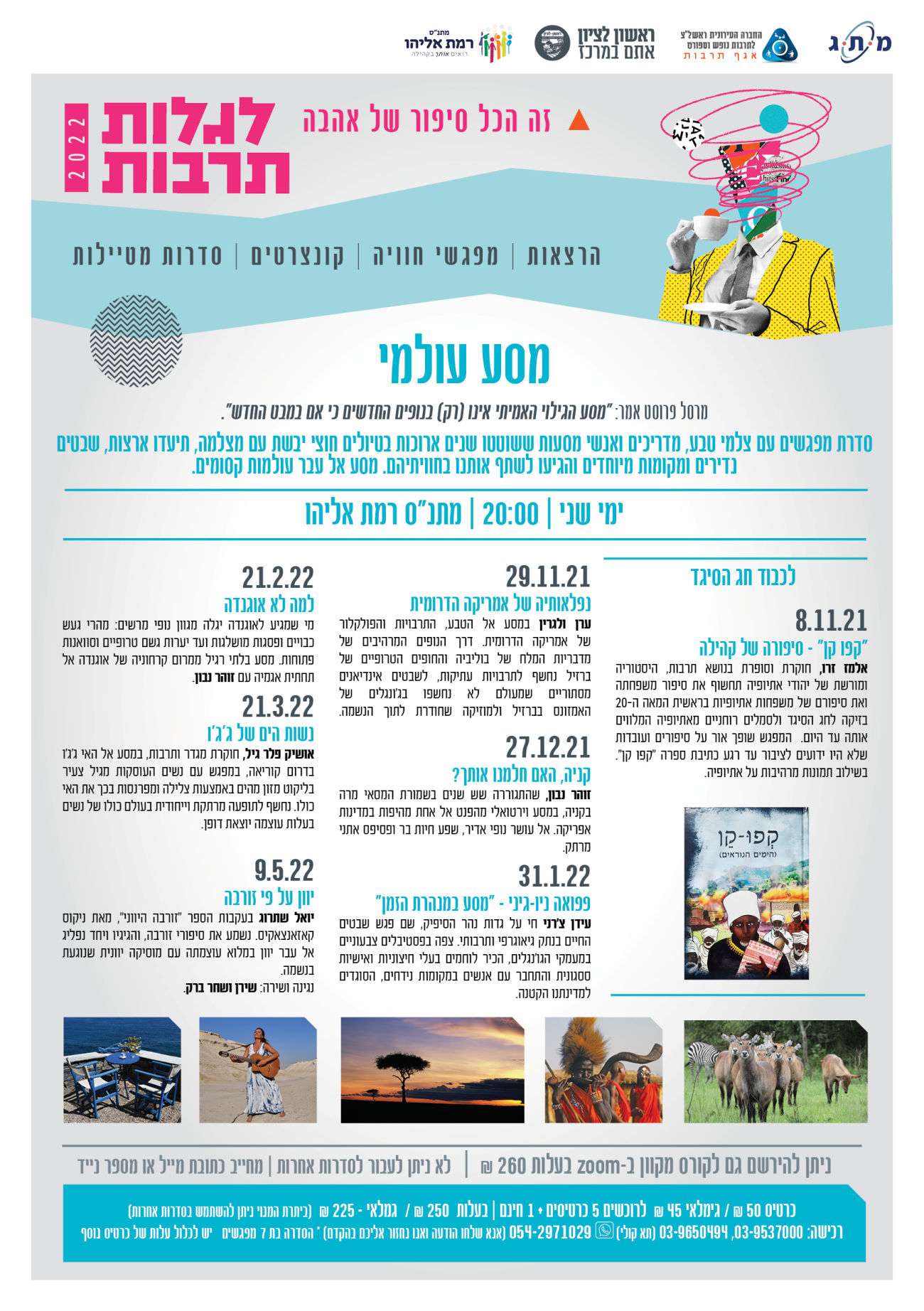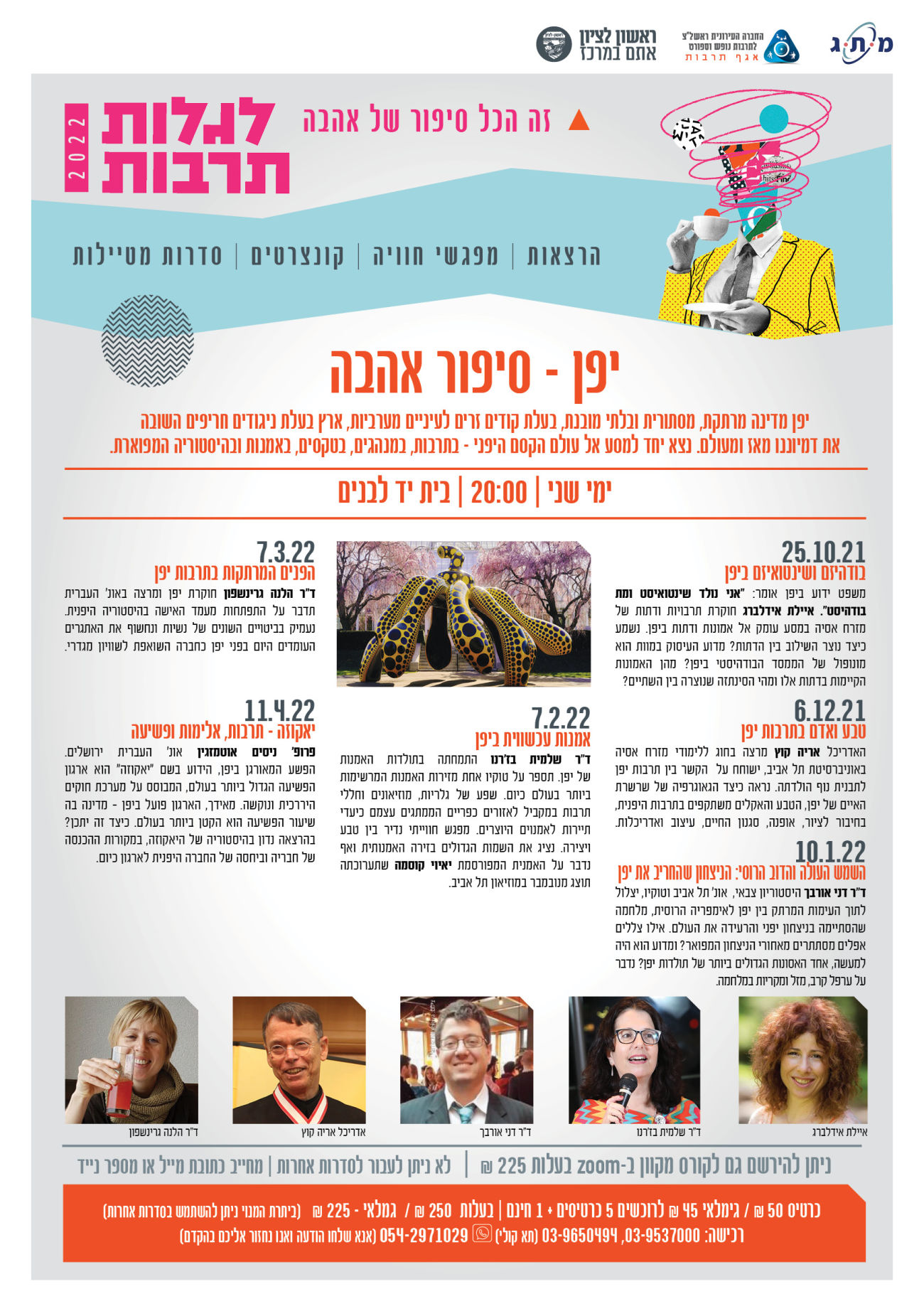 אירוע הפתיחה יתקיים ב16.10 מוצ"ש בשעה 19:30 עם הזמרת לימור שפירא במופע "נשמה יהודית", נותרו עוד מעט כרטיסים , הקדימו להירשם . ב25.10 תפתח סדרת המפגשים על יפן עם איילת איידלברג ועוד.