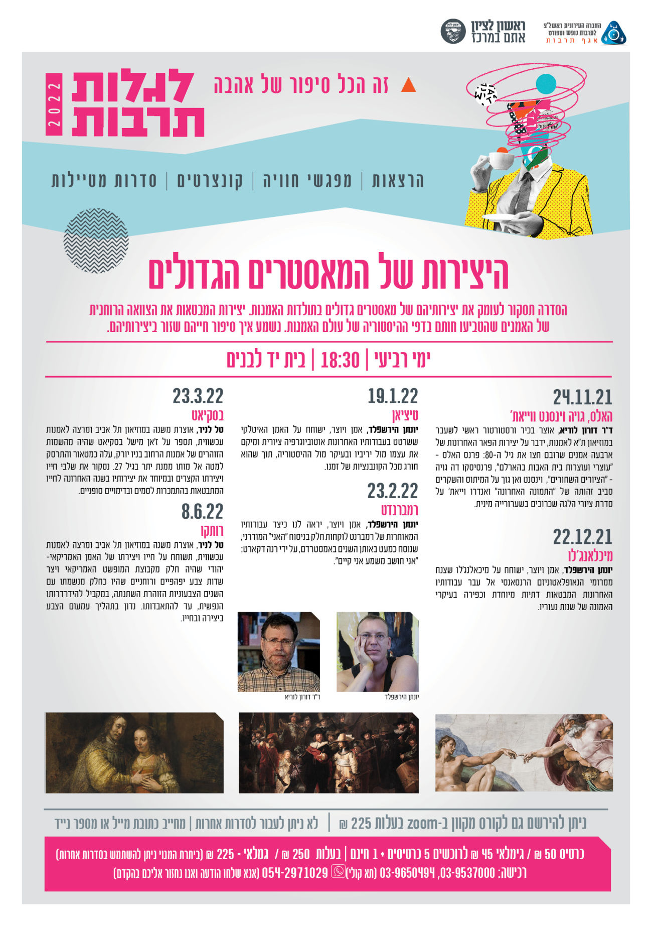השנה תוכלו לחגוג את התנ"ך, לצאת למסעות פילוסופיים עם ד"ר חיים שפירא תושב ראשון לציון להציץ אל נבכי המוח עם ד"ר קרן בן יצחק, להכיר את המיטב של יפן עם מיטב המרצים בתחומם, להבין את המאסטרים הגדולים בתולדות האמנות עם יונתן הירשפלד אמן ויוצר, ד"ר דורון לוריא וטל לניר הנחשבים בין טובי המרצים בארץ, להרים מסך בסדרת מפגשים מרתקים עם נשים מעוררות השראה מתחומי האמנות, הספרות, התיאטרון והתקשורת שיספרו את סיפור חייהן המרגש, וידברו על האתגרים החברתיים ממבט מגדרי, ליהנות מסדרת קונצרטים בניהולו של הווירטואוז ליאוניד פטשקה, לצאת לטיולי בוטיק ברחבי הארץ ולפגוש צלמי טבע ומדריכי טיולים שראו את נפלאות העולם וחזרו כדי לספר ועוד ועוד.