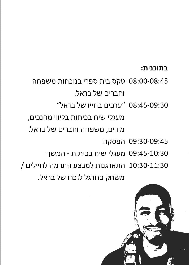 2. ביום שישי 26.11.21 עתיד להתקיים טקס זיכרון במעמד בני המשפחה וחבריו של בראל שמואלי ז"ל וכן יתקיימו מעגלי שיח