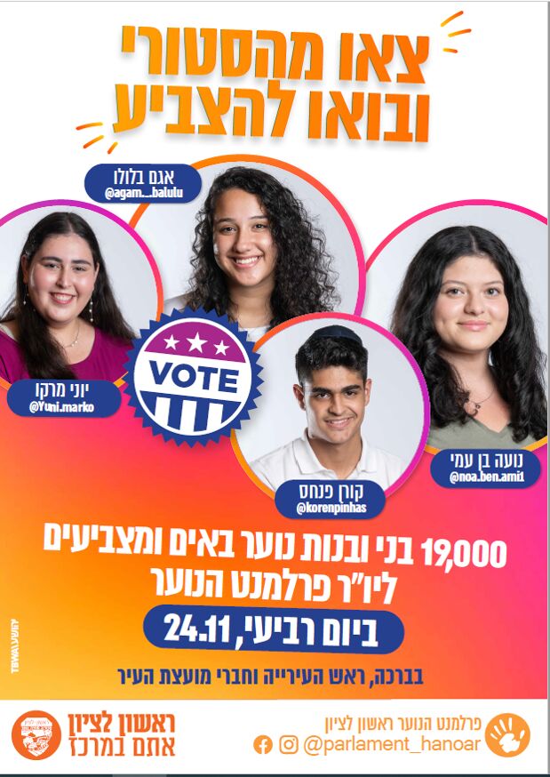 מי יהיה יו"ר פרלמנט הנוער של ראשון לציון- נועה בן עמי? קורן פנחס? אגם בלולו? יוני מרקו? ההכרזה על הזוכה תשודר הערב (רביעי 24.11) בעמוד הפייסבוק של פרלמנט הנוער