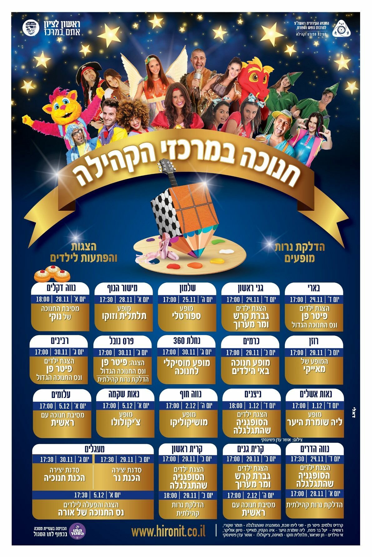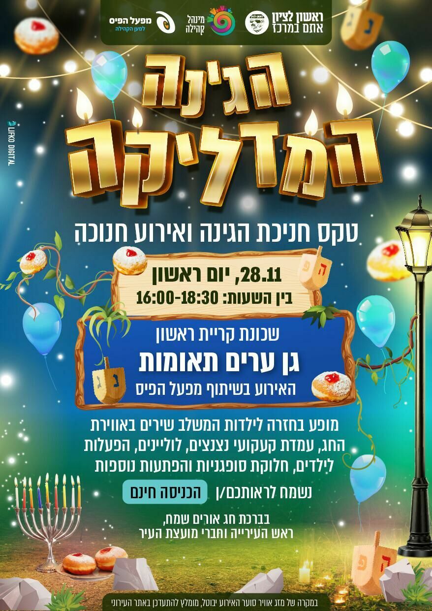 אירועי חנוכה בראשון לציון ליום ראשון 28.11! מאירים את ראשון לציון ברחבת העירייה עם חנוכיית לדים, מופעי לייזר, בובות ענק, תלתלית וזוקו במישור הנוף, הגינה המדליקה בפארק ערים תאומות עם מופעי ילדים, קרקס, סופגניות ועוד