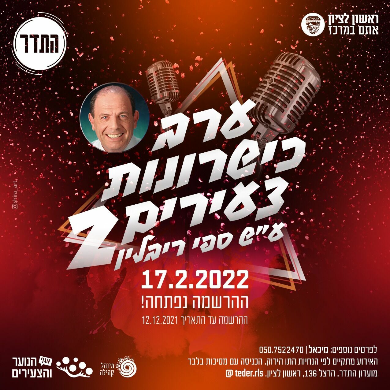 מועדון התדר בראשון לציון מזמין בני נוער בגיל 13-18 להירשם לערב כישרונות צעירים ע"ש ספי ריבלין בתחומי אומנות הבמה, צילום, ציור, פיסול ועוד; ההרשמה תיסגר ב12.12