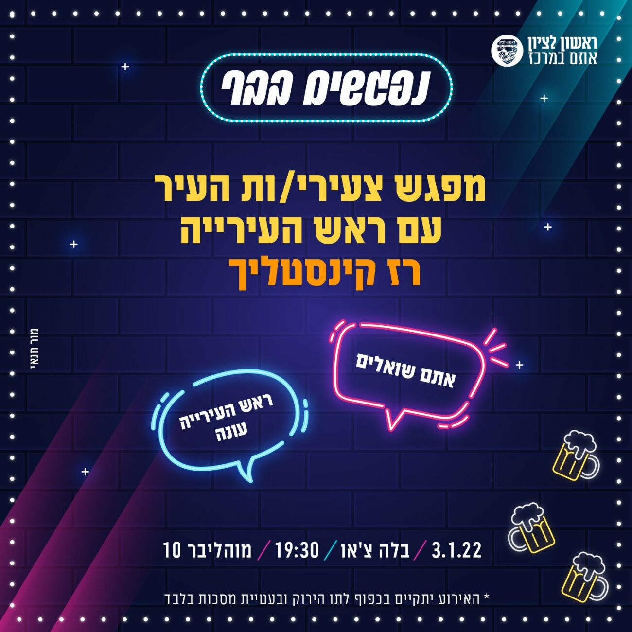 מרכז הצעירים מזמין את צעירי העיר למפגש עם ראש העיר, רז קינסטלך ולקבל מענה לשאלותיהם. ביום שני 3.1.22 יתקיים מפגש מיוחד עם ראש העיר כחלק מסדרת המפגשים אותם הוא מקיים עם התושבים ובשכונות. במפגש תוכלו לשאול על כל הנושאים שמעסיקים אתכם: חניה, דיור, תחבורה ציבורית, תרבות, מעורבות חברתית, השכלה , מלגות , תעסוקה ועוד ועוד ועוד