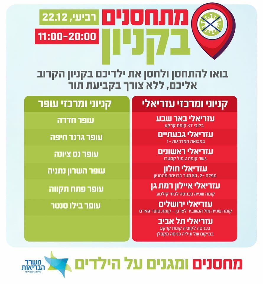 על מנת להנגיש את החיסונים לציבור, מחר (רביעי 22.12) יצרפו למאמץ הלאומי קניוני עזריאלי וקניוני עופר, שיציבו ב13 קניונים ניידות חיסונים למבקרים ולילדים.