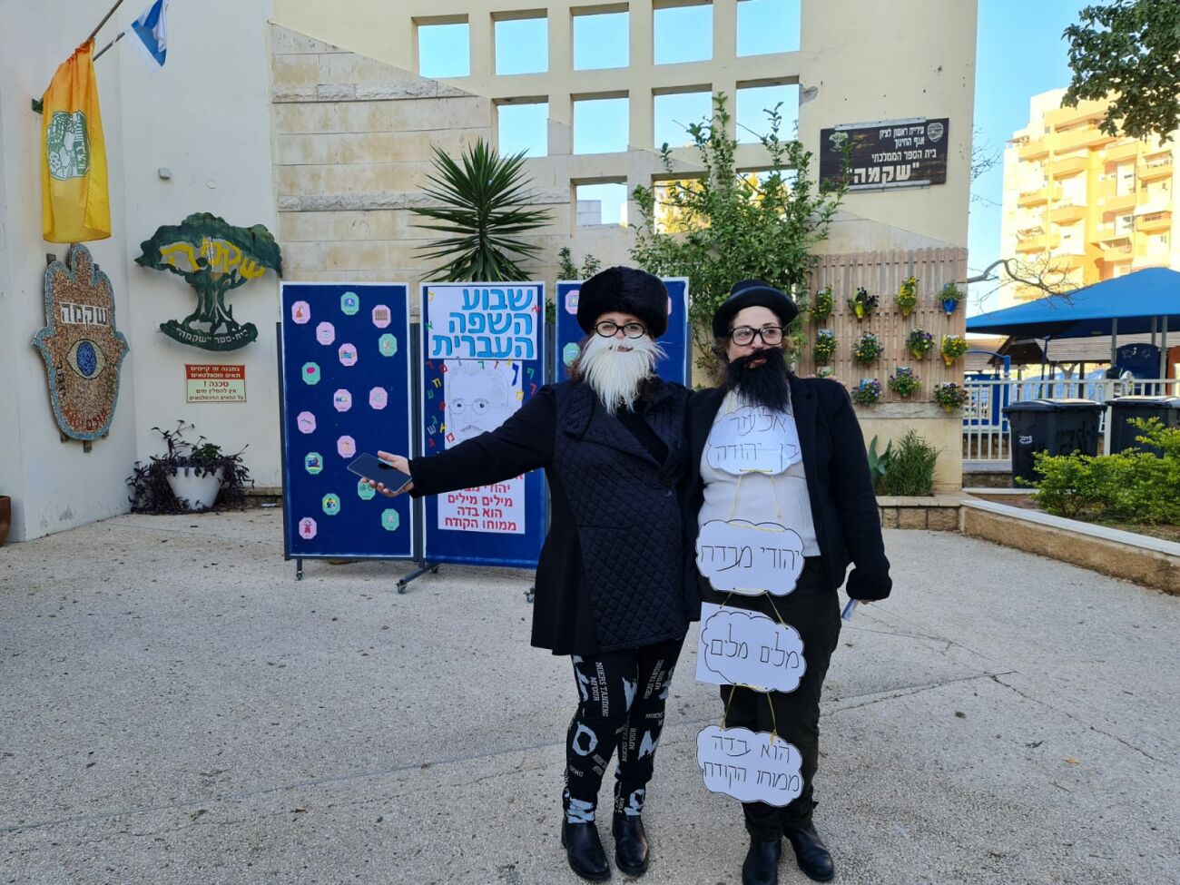 לרגל שבוע השפה העברית המצוין בבתי הספר. החליטה מנהלת בית הספר "שקמה" רינת ולטר שטיינמץ וגננת החטיבה הצעירה אתי קדוש לקבל את התלמידים בשירים וריקודים כאשר הן מחופשות לאליעזר בן יהודה מחייה השפה העברית