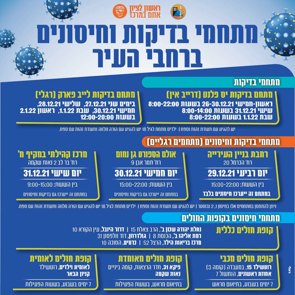 ביום רביעי 29.12 יפעל מתחם חיסונים ובדיקות ברחבת בניין העירייה משעה 15:00 ועד 22:00