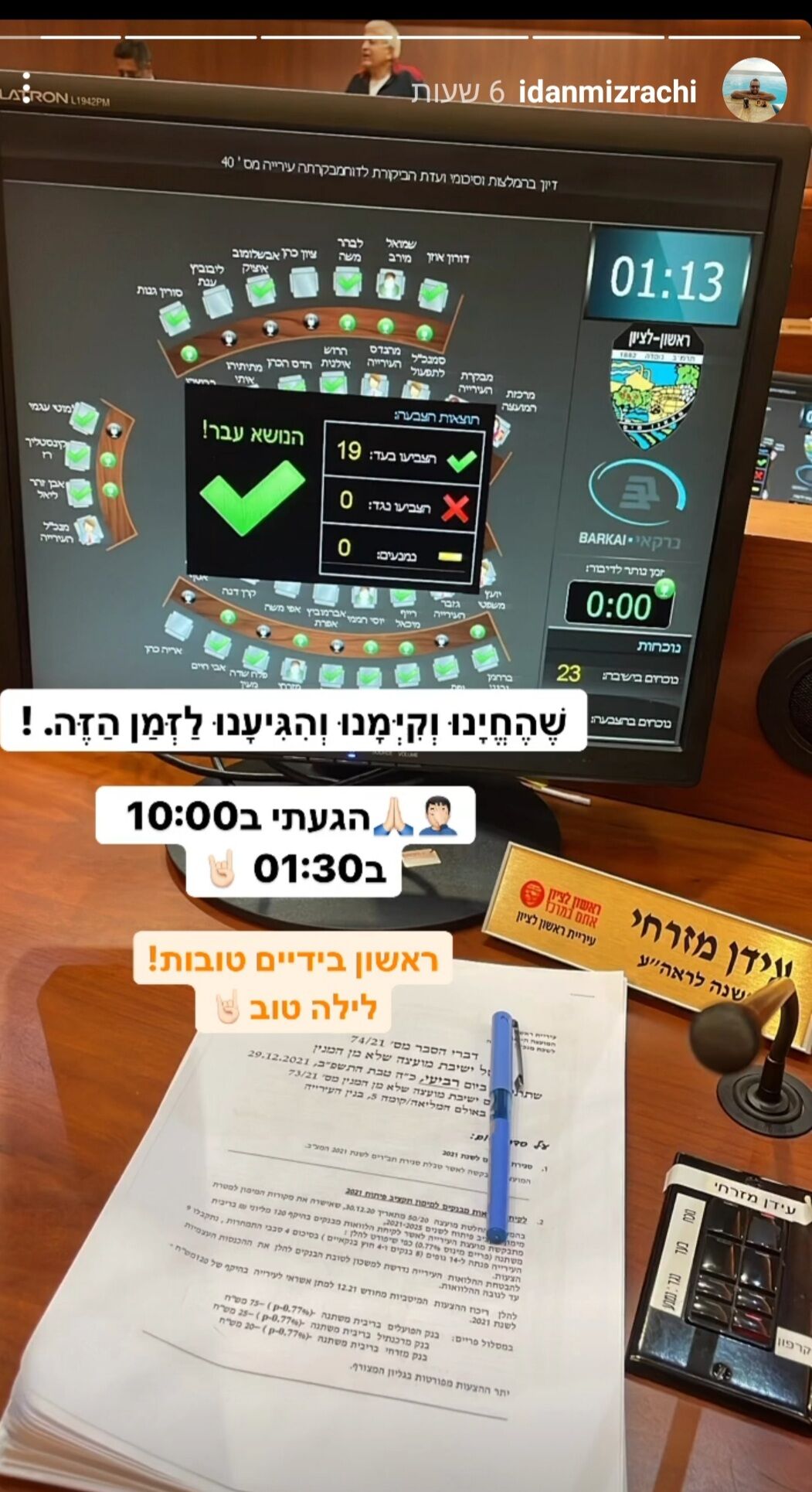 אמש התקיימה ישיבת מועצת ראשון לציון - שנחשבת לישיבה החשובה ביותר בכל שנה: ישיבת התקציב. נושא התקציב הוא נושא רגיש אשר מעורר הרבה שאלות וויכוחים בקרב ישיבות התקציב וחברי המועצה עד לאישורו. גם השנה הייתה הישיבה ארוכה מהרגיל - 6 שעות והסתיימה לאחר 1 לפנות בוקר. חברי המועצה העייפים העבירו את הזמן בין הדיונים בתמונות וסטטוסים שהעלו ובכך נתנו לנו הצצה לאיך נראית הישיבה מבפנים.