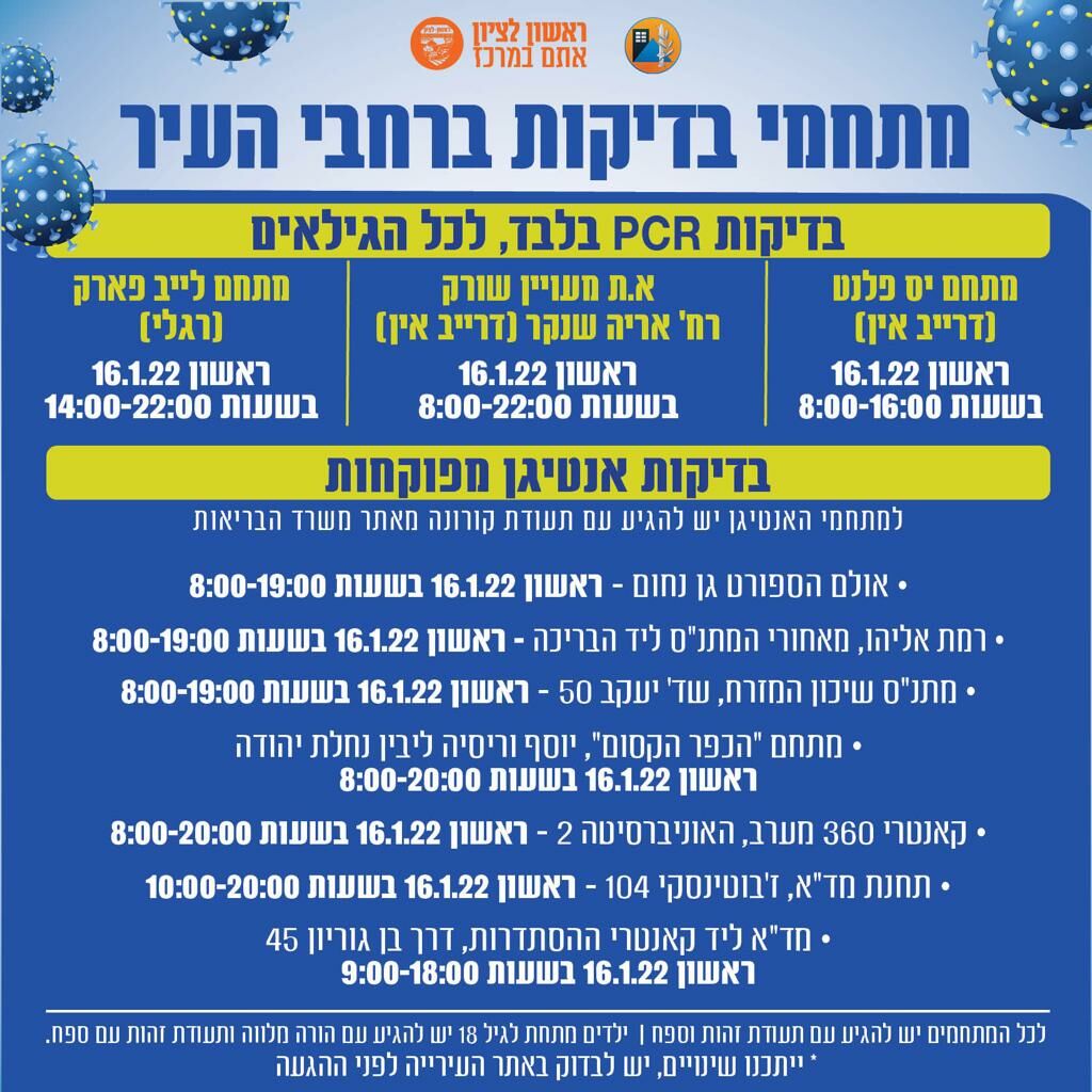 נגיף האומיקרון עדיין איתנו, ובעיריית ראשון לציון הגדילו את מתחמי הבדיקות למען רווחת התושבות והתושבים. היום (ראשון 16.1) יהיה ניתן לבצע בדיקות PCR בשלושה מוקדים: