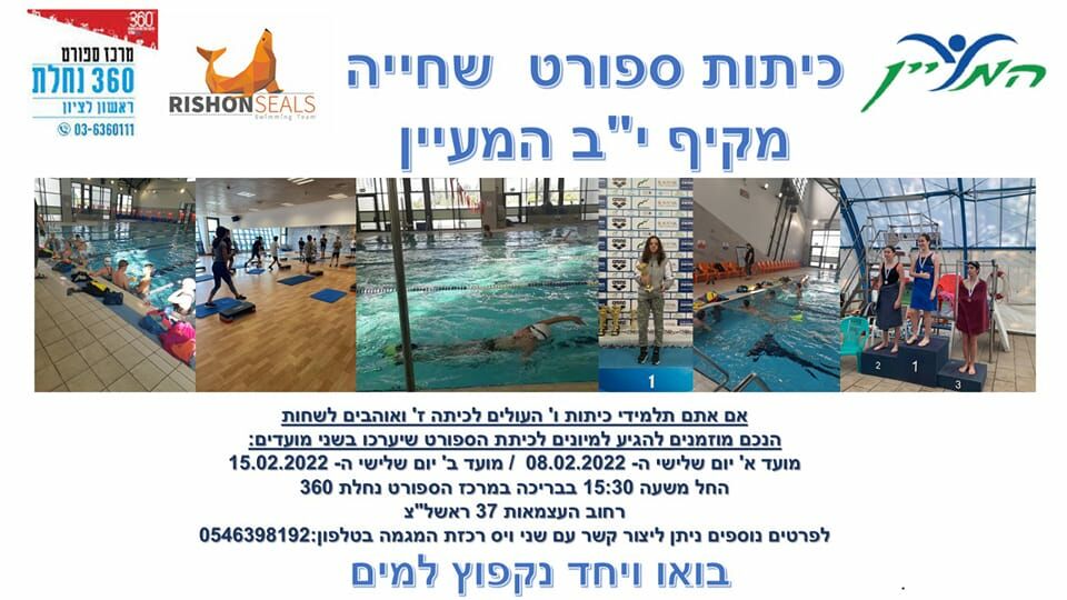 בימי שלישי 8.2 וב15.2 יקיים מקיף י"ב המעיין בראשון לציון יום מיונים למגמת ספורט השחייה של בית הספר לבוגרי כיתות ו'; להרשמה 03-9644002